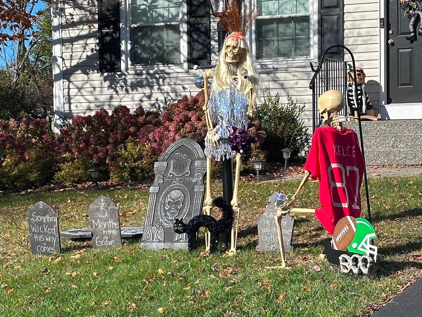 Of course, I have to give a shout-out to Halloween costumes—the weirder, the wilder, the better. And creative Halloween decorations, like the Skeleton Travis Kelce Proposing to Skeleton Taylor Swift setup in my neighbor’s yard.