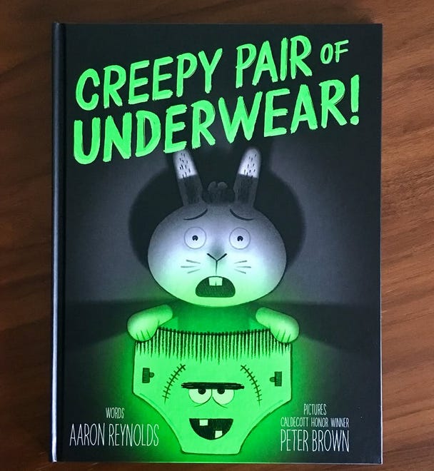 So I told my publisher, “I’m open to doing it, but I’ve got to have a good story, and right now I don’t.” Years passed, and I didn’t think I was going to do it. I was at a school, and we were talking about Creepy Carrots!, and this kid came up to me afterwards. I’ll never forget this kid. He said [using deep booming voice], “Aaron Reynolds, that Creepy Carrots! book? Hilarious.” He was so funny. He was the weirdest little kid. He said, “You need to write a book about scary underpants.” And I was like, “That’s good.” Immediately that was very funny to me. I went home and that idea kept bouncing around in my head, and I’m like, “Huh. Creepy underwear. Creepy underwear. Okay...” And the story came in this idea of glow-in-the-dark underwear. I don’t know where it came from, but it just popped into my head, and it took shape. And if I’ve got a story that I can be happy with, then yeah, I’m excited to do another book about it. But the idea came from a kid who said I should do a book about scary underwear.