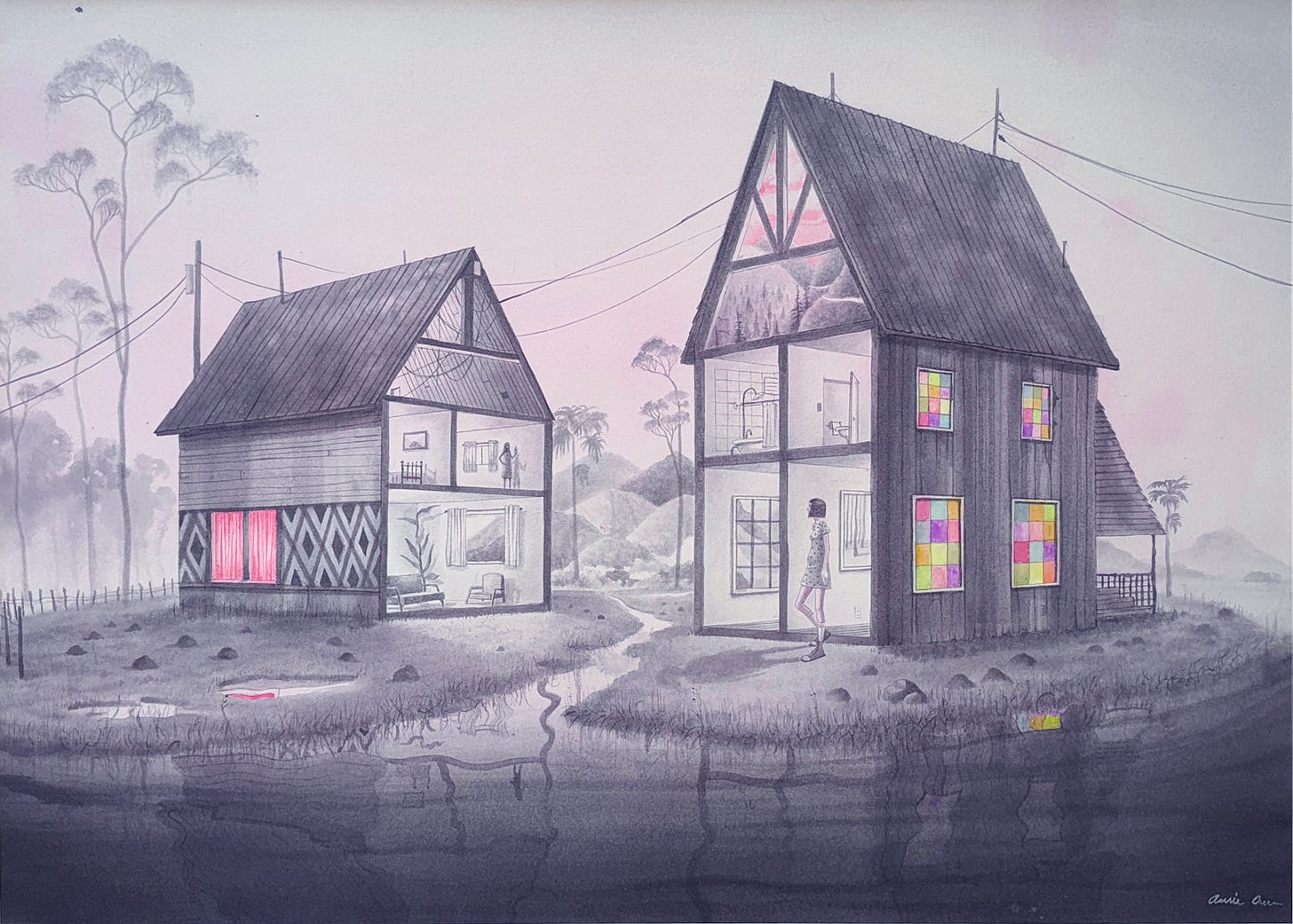 You mentioned before that you tend to not use a lot of bright colors, but one of your paintings, “Two Sisters,” has a series of bright colors in the windows. What made you decide to use colors in that one?