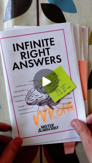 We made a zine called Infinite Right Answers. It’s an interactive zine, so it’s part workbook. It has things like photocopied CVS receipts where we had ideas, but also inspiring things about confidence and generosity and how to be good creatives to each other. It’s intended to be the answers to the questions people always ask us about our process. We don’t have time to write a book, because we’re sandwich generation and we are making art, so we were like, “Well, we could make a zine...” So we did.
